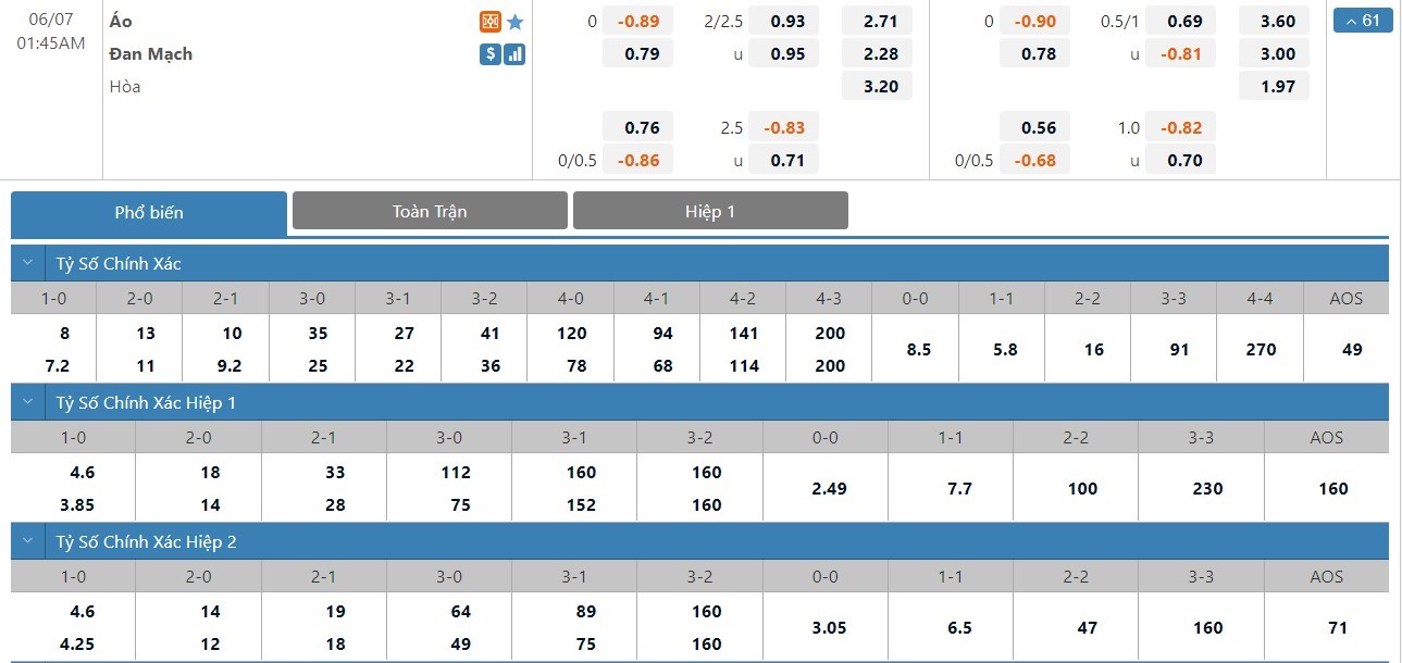 Soi kèo tài xỉu, kèo tỷ số Áo vs Đan Mạch