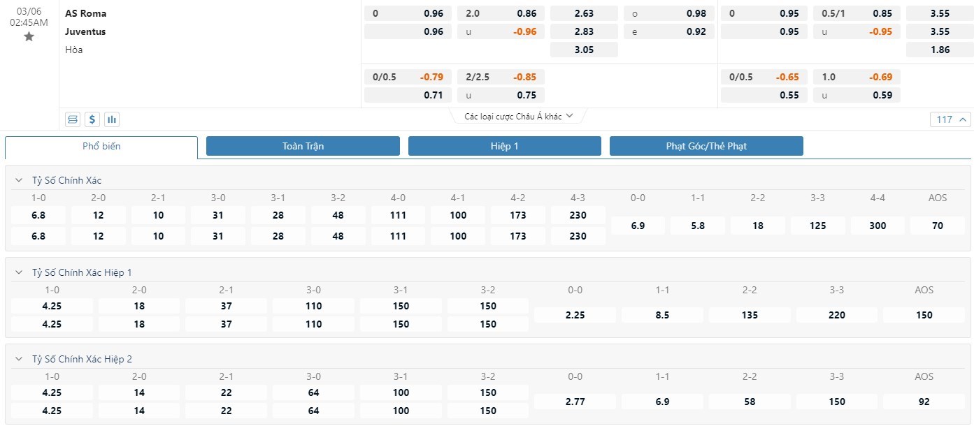 Soi kèo tài xỉu, kèo tỷ số AS Roma vs Juventus