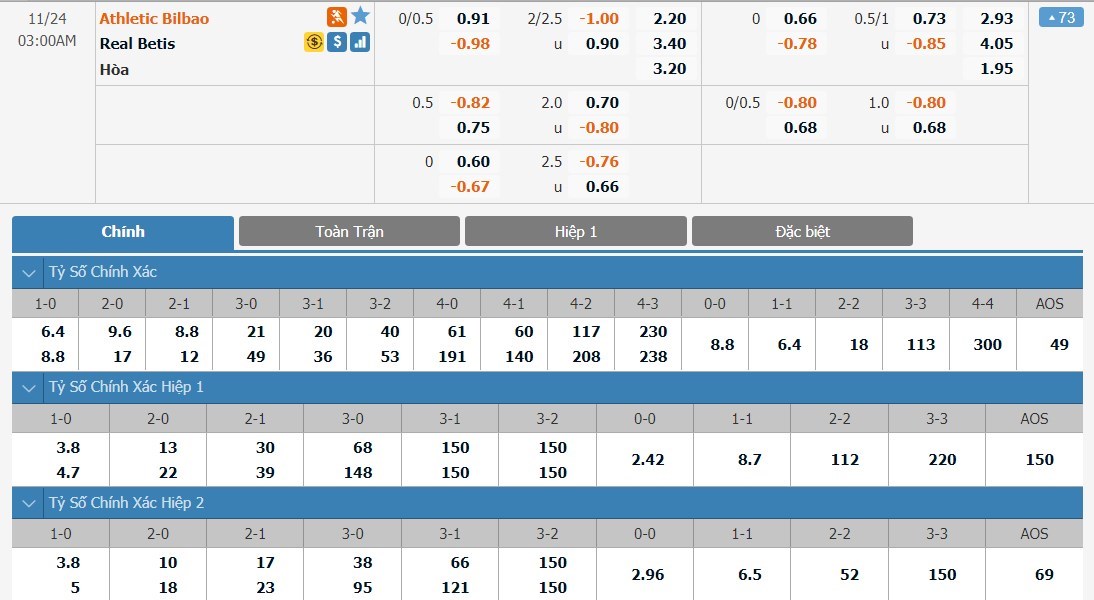 Dự đoán kèo tỷ số hiệp 1: Athletic Bilbao 1-0 Real Betis