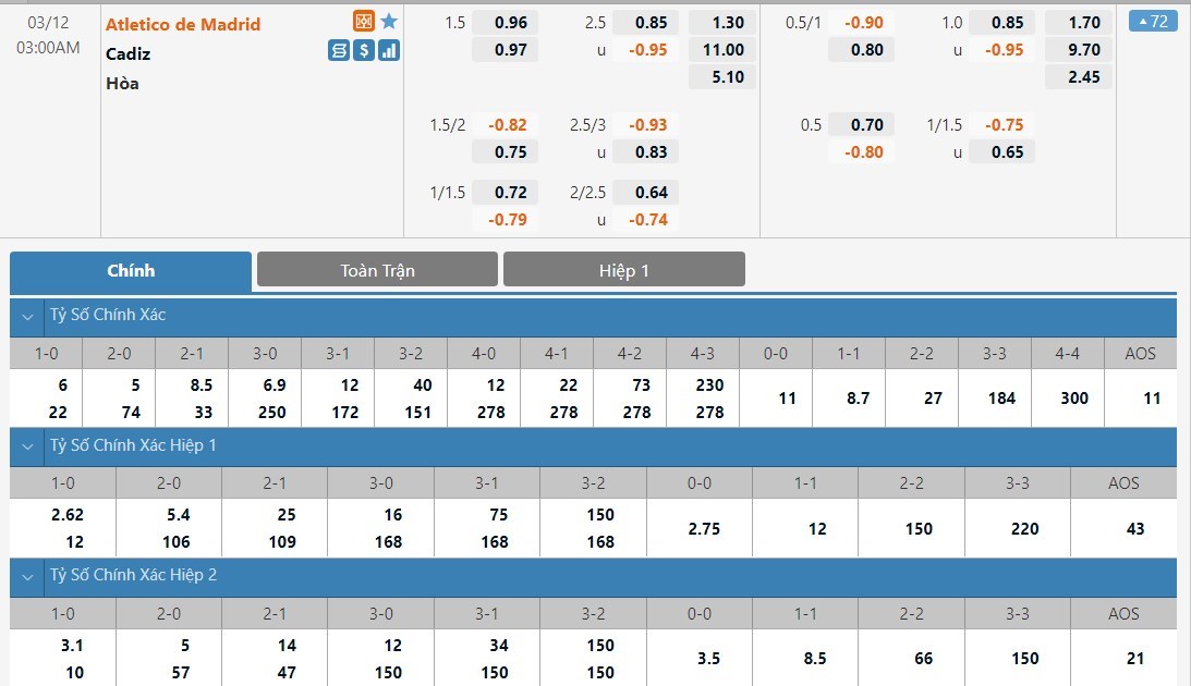 Dự đoán kèo tỷ số hiệp 1: Atletico Madrid 2-0 Cadiz