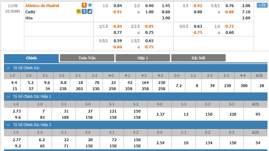 Dự đoán kèo tỷ số hiệp 1: Atletico Madrid 1-0 Cadiz
