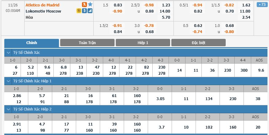Dự đoán kèo tỷ số hiệp 1: Atletico Madrid 1-0 Lokomotiv Moscow