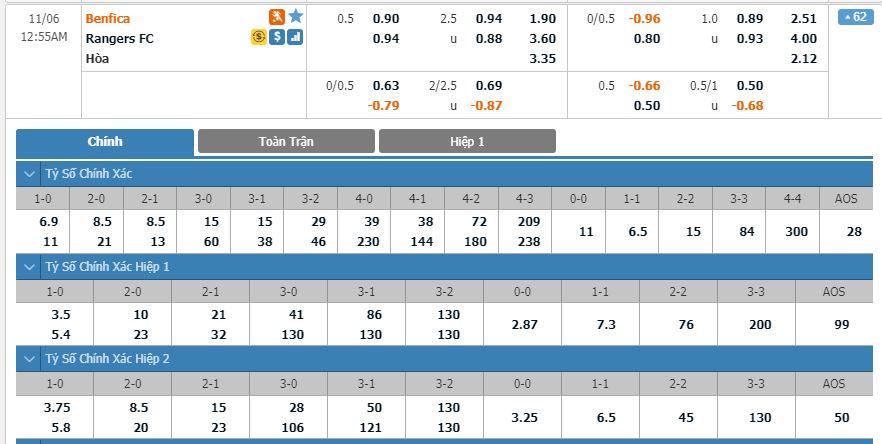Soi kèo tài xỉu, kèo tỷ số Benfica vs Rangers