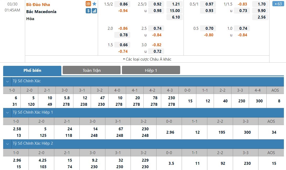 Dự đoán kèo tỷ số hiệp 1: Bồ Đào Nha 2-0 Bắc Macedonia