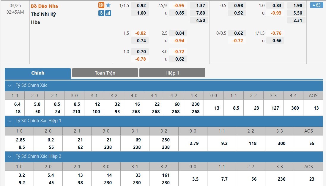 Kèo châu Á toàn trận: Thổ Nhĩ Kỳ +1 1/4 (FT)