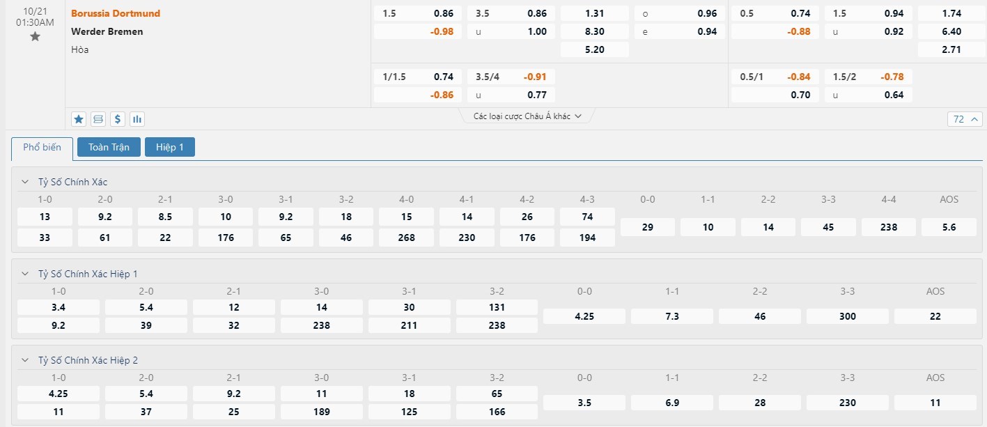 Dự đoán kèo tỷ số hiệp 1: Borussia Dortmund 1-0 Werder Bremen