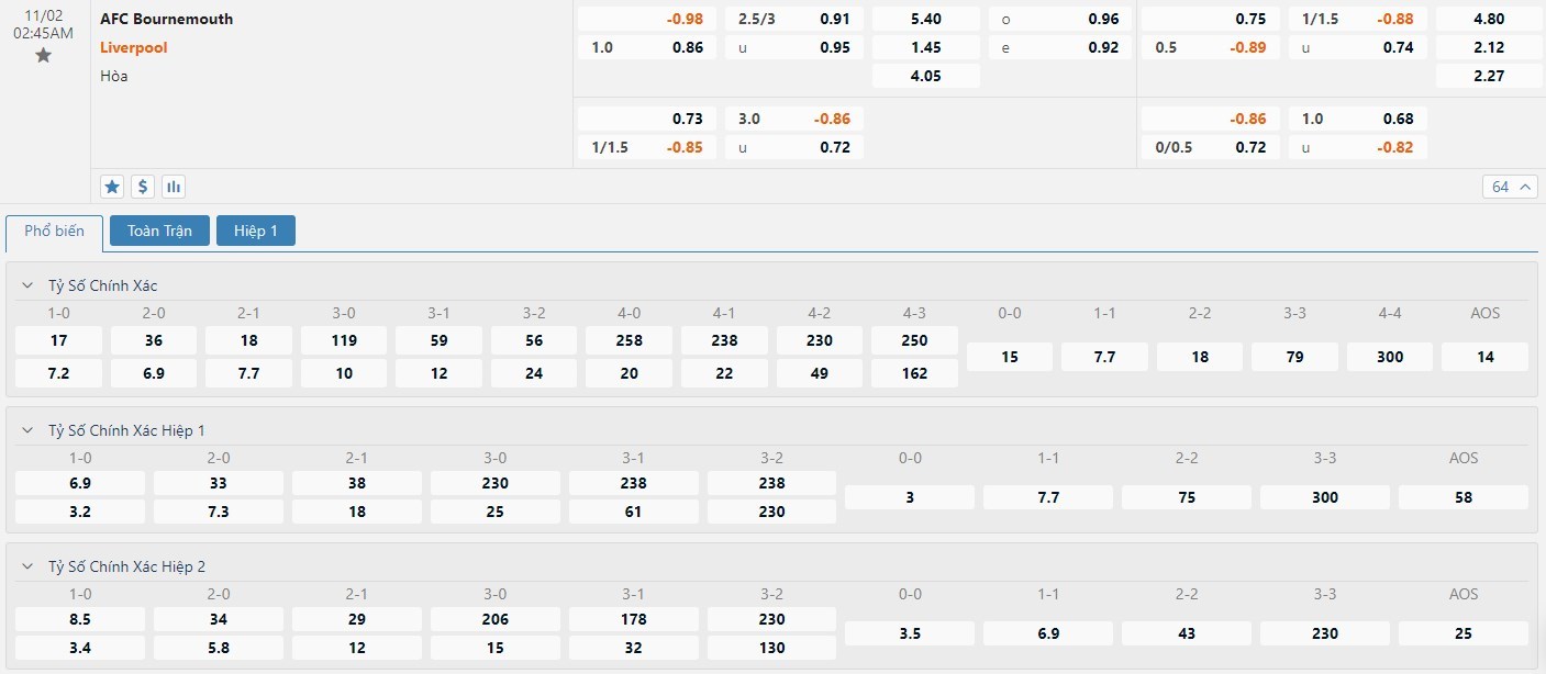 Soi kèo tài xỉu, kèo tỷ số Bournemouth vs Liverpool