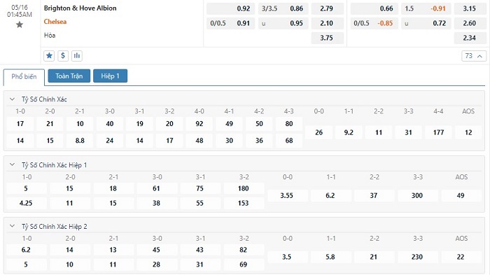 Người hâm mộ có quyền chờ đợi vào một trận đấu nhiều bàn thắng. Thống kê chỉ ra rằng 4/5 màn đối đầu gần nhất giữa Brighton và Chelsea xuất hiện từ 3 bàn trở lên. Trong 4 trận gần nhất của Chelsea, có tới 3 trận kết thúc với ít nhất 4 bàn. Trận cầu của 2 đội này được dự đoán sẽ có một thế trận rất cởi mở khi đôi bên không còn đặt nặng toan tính chiến thuật trong những trận đấu mang tính thủ tục còn lại. Với tỷ lệ tài xỉu ở mức 3 1/4 trái, ô cược tài sẽ là lựa chọn cho kèo đấu này.