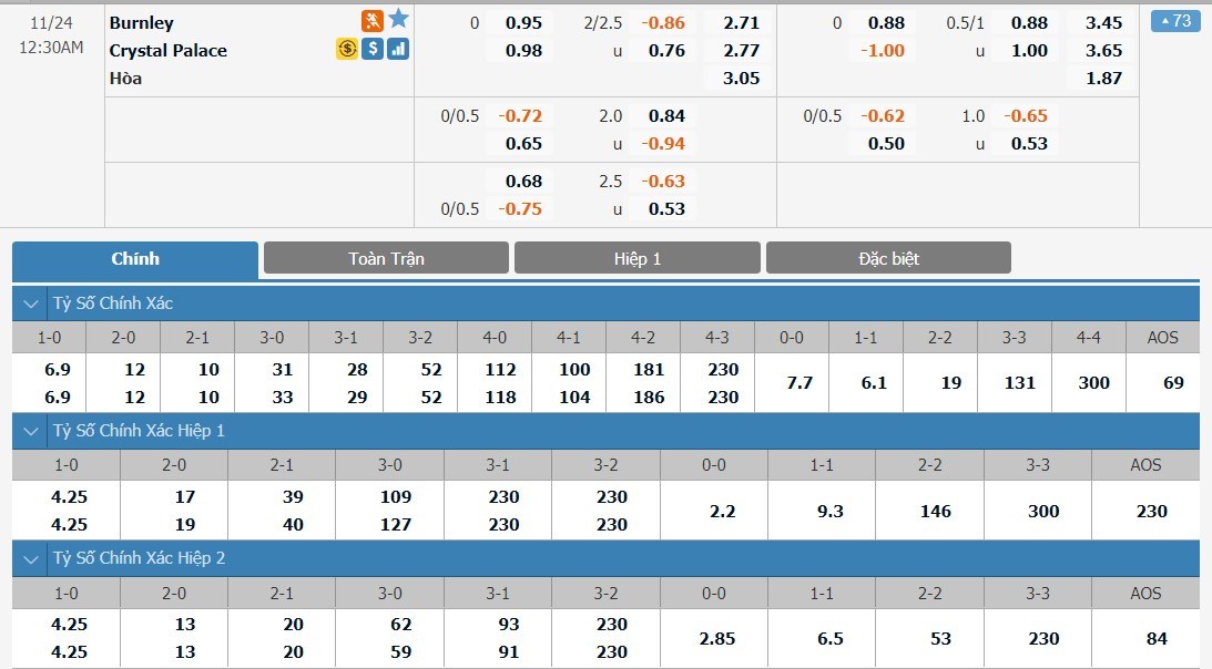 Tỷ lệ cược của Burnley và Crystal Palace ở trận đấu này khá cân bằng. Burnley có tỷ lệ ở mức 1 ăn 2.71 trong khi Crystal Palace có tỷ lệ 1 ăn 2.77. Tỷ số hòa có tỷ lệ 1 ăn 3.05. Đây là giai đoạn mà Burnley đang thi đấu tệ hại. Trong khi đó Crystal Palace lại trình diễn được một lối chơi khá tích cực và họ đang tỏ ra hiệu quả hơn nhiều so với đội chủ nhà. Với kèo đấu này, cửa cược Crystal Palace sẽ là lựa chọn được đánh giá cao hơn.