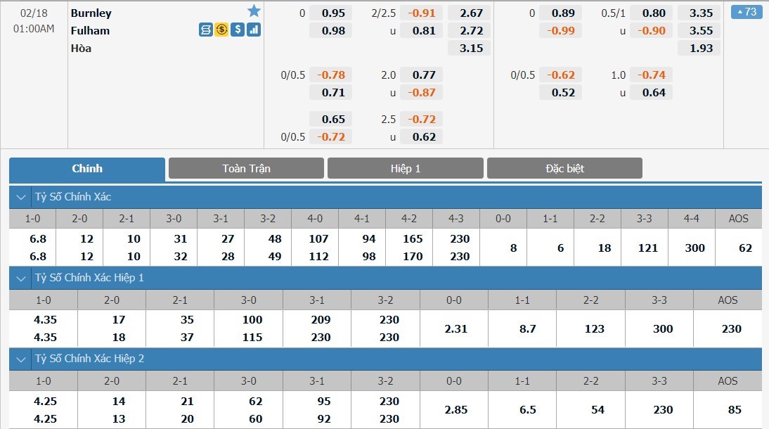 Tỷ lệ cược của Burnley và Fulham ở kèo đấu này gần như không có sự chênh lệch. Burnley có tỷ lệ cược là 1 ăn 2.67 trong khi đó Fulham có tỷ lệ cược là 1 ăn 2.72. Tỷ số hòa có tỷ lệ cược là 1 ăn 3.15. Burnley sau quãng thời gian đầu mùa thi đấu kém cỏi đang thi đấu tiến bộ hơn nhiều. So với Fulham, Burnley đang tỏ ra nhỉnh hơn về thực lực. Cùng với lợi thế sân nhà, Burnley được dự đoán sẽ là đội giành trọn 3 điểm ở trận này.
