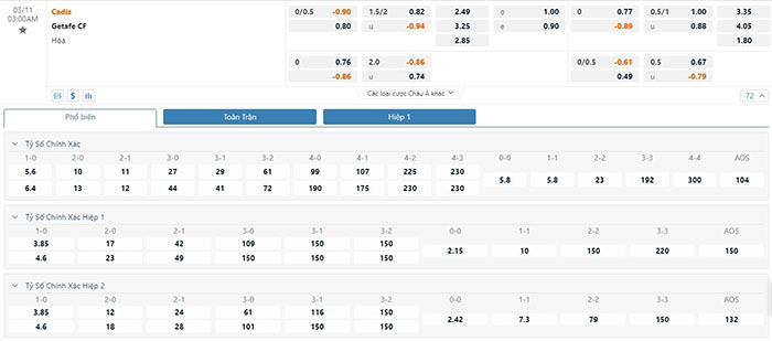 Soi kèo tài xỉu, kèo tỷ số Cadiz vs Getafe