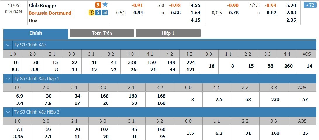 Dự đoán kèo tỷ số hiệp 1: Club Brugge 0-2 Borussia Dortmund