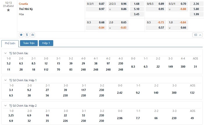 Dự đoán kèo tỷ số hiệp 1: Croatia 0-0 Thổ Nhĩ Kỳ