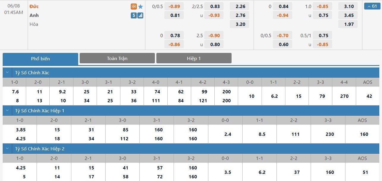 Soi kèo tài xỉu, kèo tỷ số Đức vs Anh
