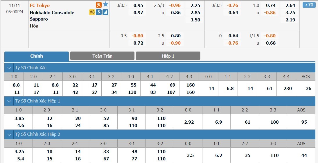 Ở cả hai lần gần đây nhất 2 đội gặp nhau, trận đấu đều kết thúc với tỷ số hòa 1-1. Hàng công của FC Tokyo cũng đang thi đấu rất nghèo nàn ở những trận vừa qua và với tỷ lệ tài xỉu ở mức 2 3/4 trái, ô cược xỉu sẽ là lựa chọn được đánh giá cao hơn cho kèo đấu này.