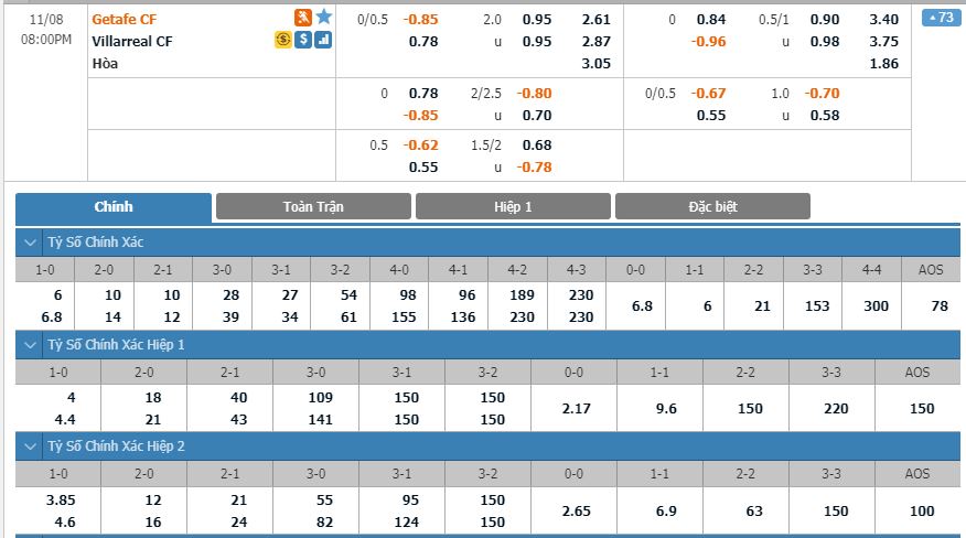 Dự đoán kèo tỷ số hiệp 1: Getafe 0-1 Villarreal