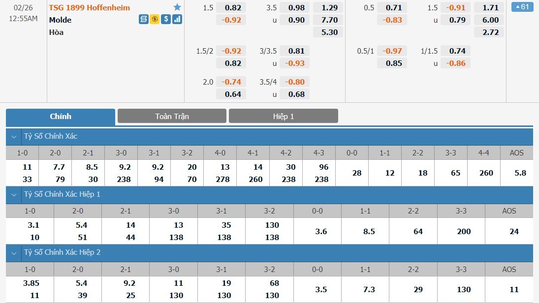 Dự đoán kèo tỷ số hiệp 1: Hoffenheim 1-1 Molde