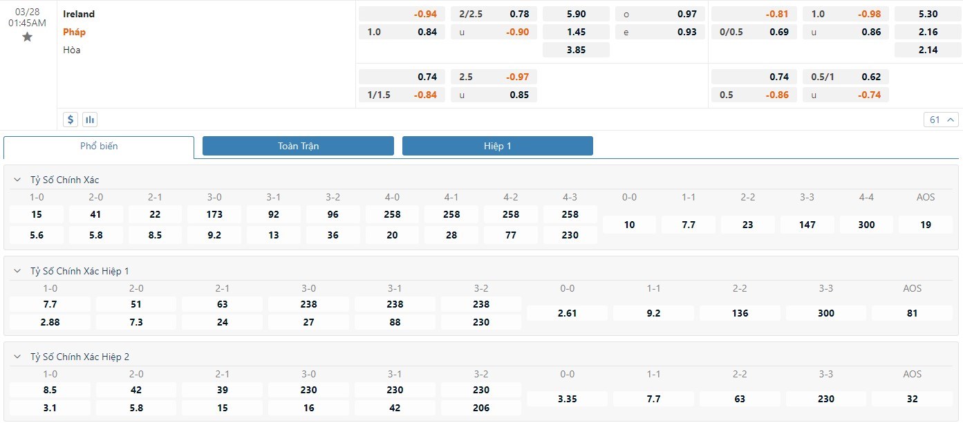 Soi kèo tài xỉu, kèo tỷ số Ireland vs Pháp