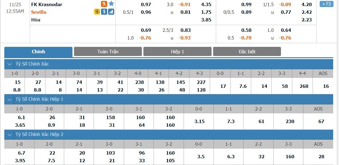 Sevilla vẫn đang được đánh giá cao hơn Krasnodar khá nhiều. Tỷ lệ cược của Sevilla ở mức 1 ăn 1.75 trong khi Krasnodar có tỷ lệ cược lên tới 1 ăn 4.35. Tỷ số hòa có tỷ lệ 1 ăn 3.85. Sevilla vẫn đang tỏ ra trên cơ so với Krasnodar. Đây còn là giai đoạn mà đội khách đang có phong độ rất cao và Krasnodar sẽ khó để tạo ra được bất ngờ ở trận này.