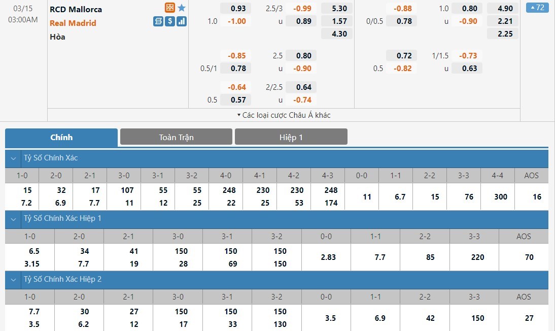 Real Madrid vẫn được đánh giá cao hơn Mallorca rất nhiều ở kèo đấu này. Tỷ lệ cược của Mallorca lên tới 1 ăn 5.30 trong khi đó Real Madrid chỉ có tỷ lệ cược là 1 ăn 1.57. Tỷ số hòa cũng có tỷ lệ cược lên tới 1 ăn 4.30. Đây là lúc mà Real Madrid đang có phong độ rất tốt. Mallorca tại La Liga đang chỉ là một đội bóng yếu và với đẳng cấp vượt trội, Real Madrid sẽ có được 3 điểm.