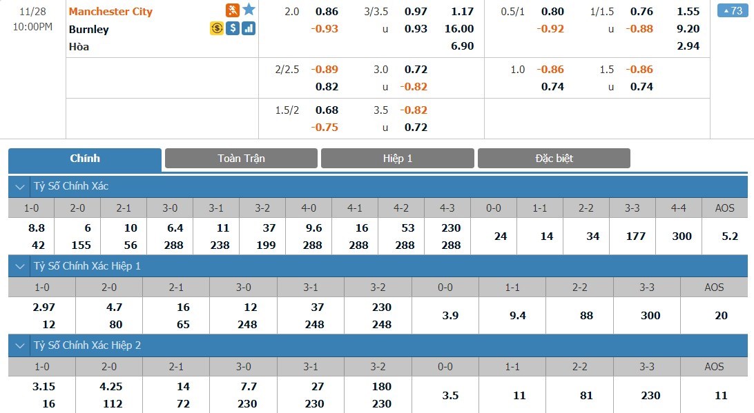 Tỷ lệ cược của 2 đội bóng ở kèo đấu này có sự chênh lệch rất lớn. Man City chỉ có tỷ lệ cược ở mức 1 ăn 1.17 trong khi Burnley có tỷ lệ cược lên tới 1 ăn 16.00. Tỷ số hòa có tỷ lệ cược 1 ăn 6.90. Thực lực 2 đội bóng này vẫn đang có sự cách biệt lớn. Burnley đang tỏ ra rất thiếu hiệu quả và họ sẽ khó để tạo ra được bất ngờ trước Man City ngay tại Etihad. 3 điểm trọn vẹn vẫn sẽ là mục tiêu trong tầm tay của Man City ở trận này.
