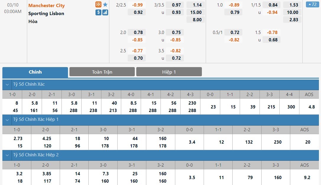 Man City và Sporting có tỷ lệ cược chênh nhau rất nhiều ở trận này. Man City chỉ có tỷ lệ cược là 1 ăn 1.14 trong khi đó Sporting có tỷ lệ cược lên tới 1 ăn 15.00. Tỷ số hòa có tỷ lệ cược là 1 ăn 8.00. Có thể thấy trình độ hai đội là khác nhau thế nào ở trận lượt đi vừa qua và Sporting sẽ không có cơ hội để tạo ra bất ngờ ở trận này.