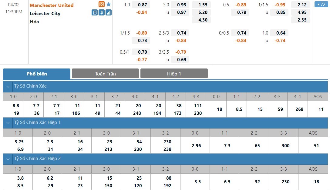 Man United được đánh giá cao hơn Leicester khá nhiều ở trận này. Tỷ lệ cược của Man United chỉ là 1 ăn 1.55 trong khi đó Leicester có tỷ lệ cược lên tới 1 ăn 5.20. Tỷ số hòa có tỷ lệ cược là 1 ăn 4.30. Man United vẫn đang trình diễn một bộ mặt đầy bất ổn. Đối thủ của họ ở trận này cũng là một Leicester không hề dễ chịu và khả năng cao Man United sẽ lại chỉ có được 1 điểm.