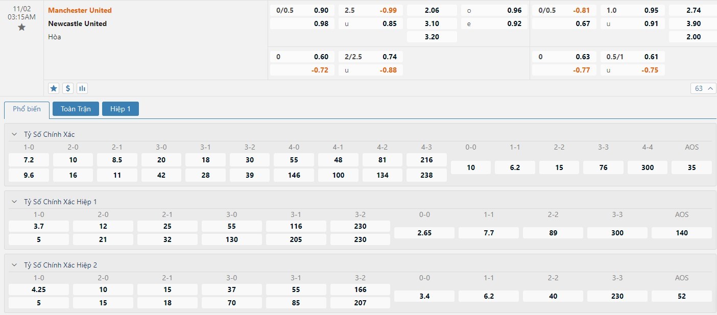 Soi kèo tài xỉu, kèo tỷ số Manchester United vs Newcastle