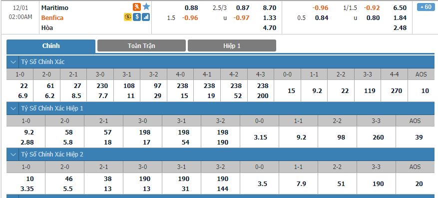 Soi kèo tài xỉu, kèo tỷ số Maritimo vs Benfica