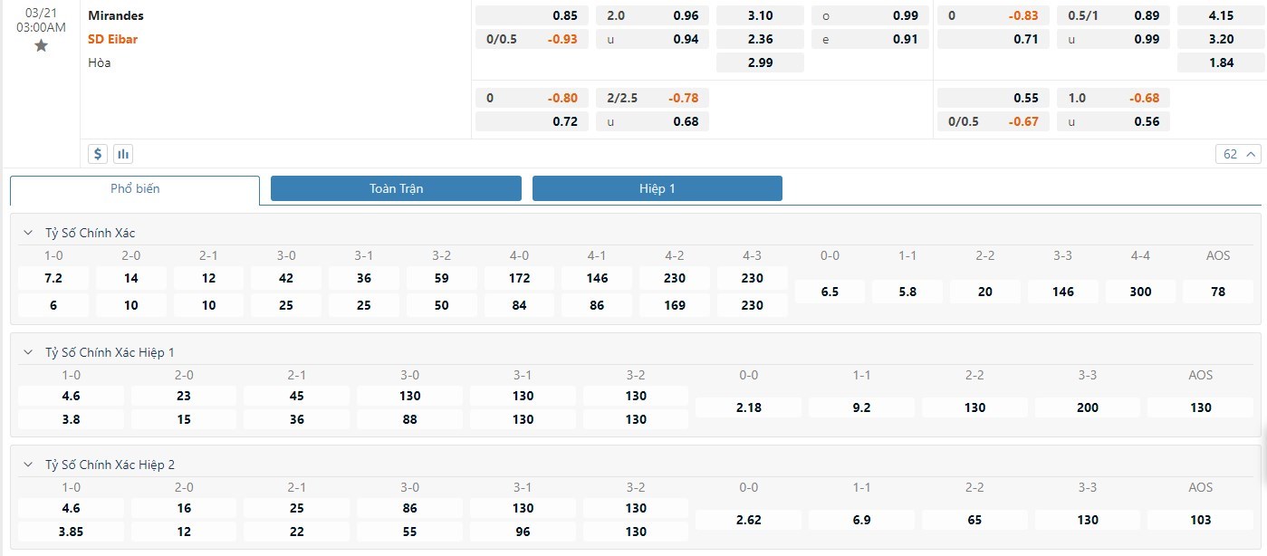Dự đoán kèo tỷ số hiệp 1: Mirandes 0-1 Eibar