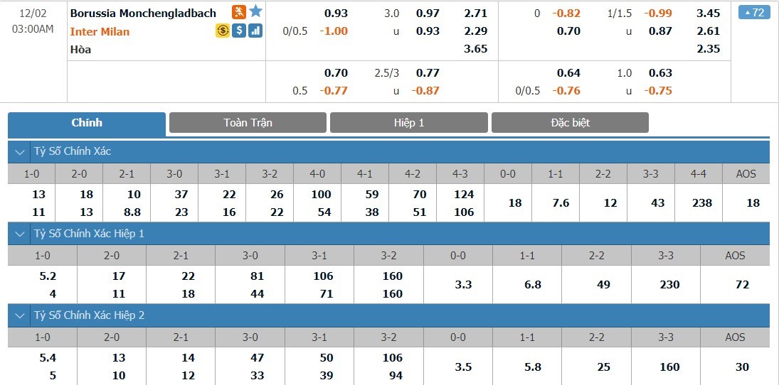 Dự đoán kèo tỷ số hiệp 1: Monchengladbach 1-0 Inter Milan