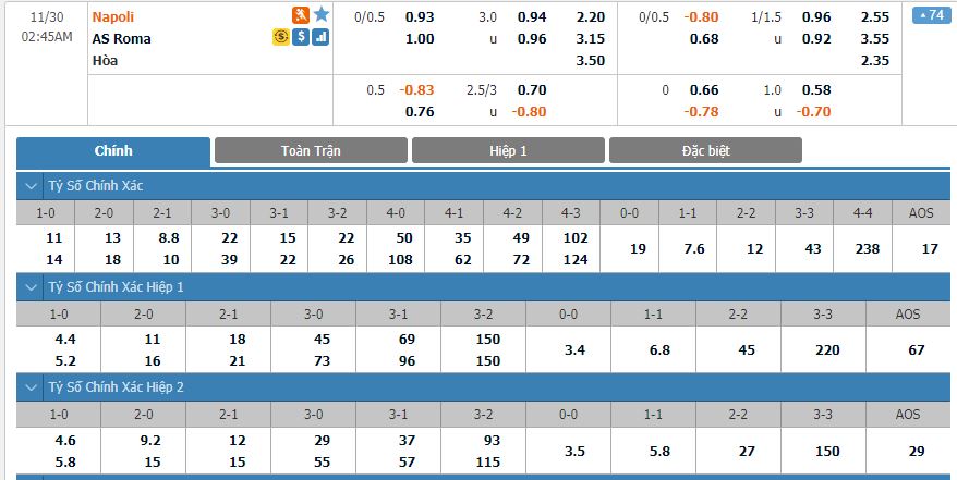 Soi kèo tài xỉu, kèo tỷ số Napoli vs AS Roma