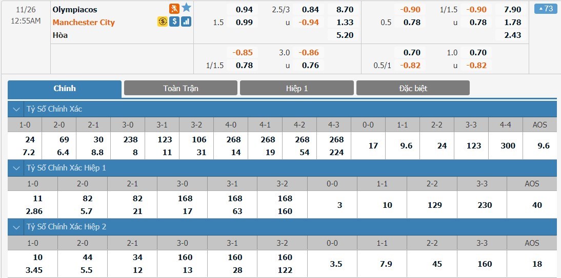 Chắc chắn là Man City vẫn đang được đánh giá cao hơn Olympiacos rất nhiều. Tỷ lệ cược giành cho Man City ở trận này chỉ ở mức 1 ăn 1.33 trong khi Olympiacos có tỷ lệ cược lên tới 1 ăn 8.70. Tỷ số hòa có tỷ lệ cược ở mức 1 ăn 5.20. Man City đang tỏ ra vượt trội hoàn toàn so với Olympiacos và đội chủ nhà sẽ rất khó để tạo ra được bất ngờ ở trận này. Đây là kèo đấu mà cửa trên an toàn sẽ là lựa chọn hợp lý hơn.