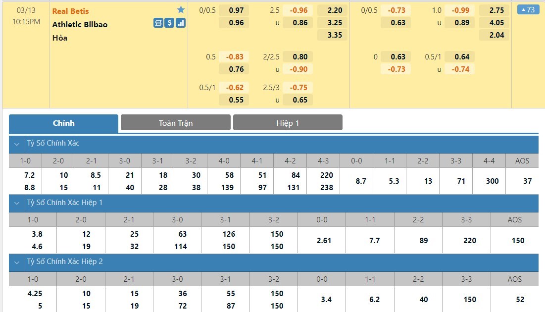Real Betis với lợi thế sân nhà sẽ có tỷ lệ cược thấp hơn đôi chút so với Athletic Bilbao ở trận này. Đội chủ nhà có tỷ lệ cược là 1 ăn 2.33 trong khi đó đội khách có tỷ lệ cược là 1 ăn 3.05. Tỷ số hòa có tỷ lệ cược là 1 ăn 3.30. 5 lần gần nhất hai đội chạm trán, Real Betis chưa từng giành được chiến thắng nào trước Athletic Bilbao. Đây là cơ sở để người chơi đặt niềm tin vào kịch bản có lợi cho Athletic Bilbao trong màn đụng độ sắp tới.