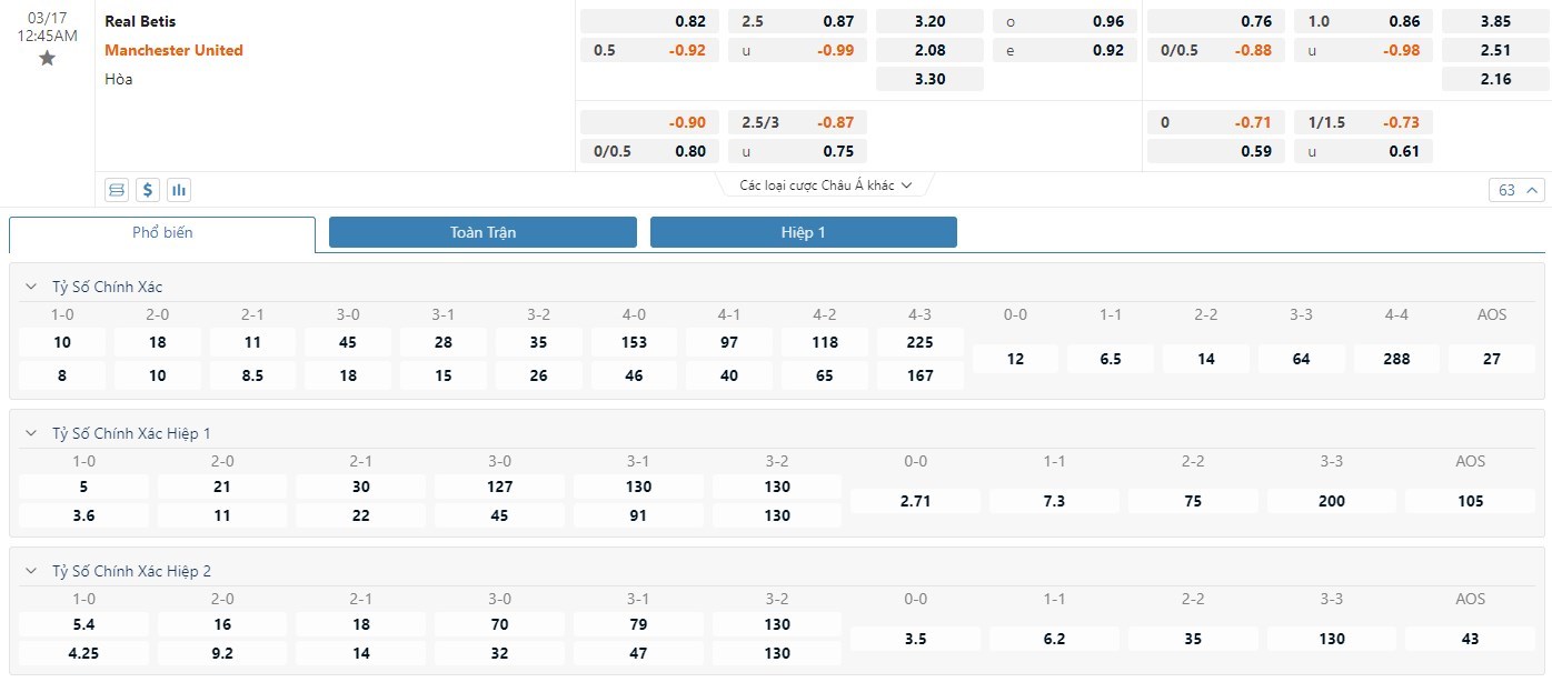 Dự đoán kèo tỷ số hiệp 1: Real Betis 0-0 Manchester United