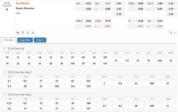 Tỷ lệ kèo ở cuộc đối đầu này là -1/2 trái nghiêng về Real Madrid và tỷ lệ này là không có gì phải bàn cãi quá nhiều vào thời điểm hiện tại. Ở 5 lần gần nhất đối đầu nhau thì Bayern Munich đã mang về được cho mình 2 thắng lợi, còn lại là 2 trận hòa và 1 trận thua. Tuy nhiên, phong độ thực tế đang cho thấy Real Madrid mới là những người duy trì được sự ổn định đáng tin cây hơn. Real Madrid bất bại 20 trận gần nhất tính trên mọi đấu trường. Trong khi đó, Bayern Munich lại có phần bất ổn khi mới nhận thất bại 1-3 dưới tay Stuttgart. Đây đã là trận thứ 2 liên tiếp mà họ không biết mùi thắng lợi. Do đó, các nhà đầu tư nên tin tưởng vào đội chủ nhà ở trận này để mang về cơ hội thắng kèo cao hơn.