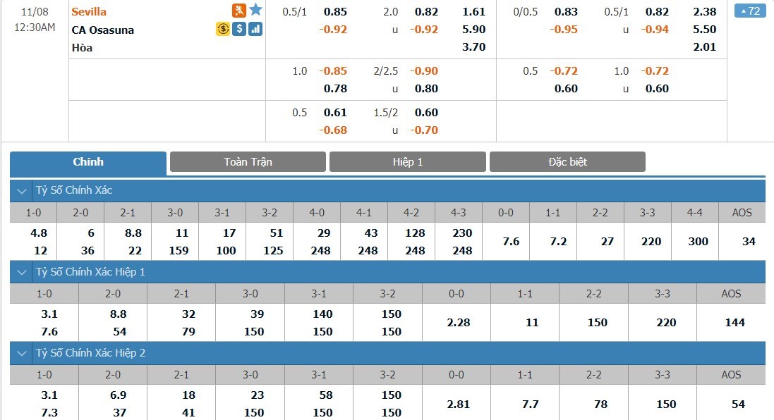 Sevilla sẽ là cửa trên ở trận này và tỷ lệ cược của họ sẽ ở mức khá thấp. Ngược lại kết quả Osasuna thắng trận cùng tỷ số hòa sẽ có tỷ lệ cược khá hấp dẫn. Phong độ của Sevilla ở quãng thời gian đầu mùa này đang là không hề thuyết phục. Trong khi đó Osasuna vẫn đang trình diễn được một lối chơi rất khó chịu. Với phong độ hiện tại, Osasuna hoàn toàn có thể sẽ có được 1 điểm ở trận này và ô cược hòa sẽ là một lựa chọn không tệ.