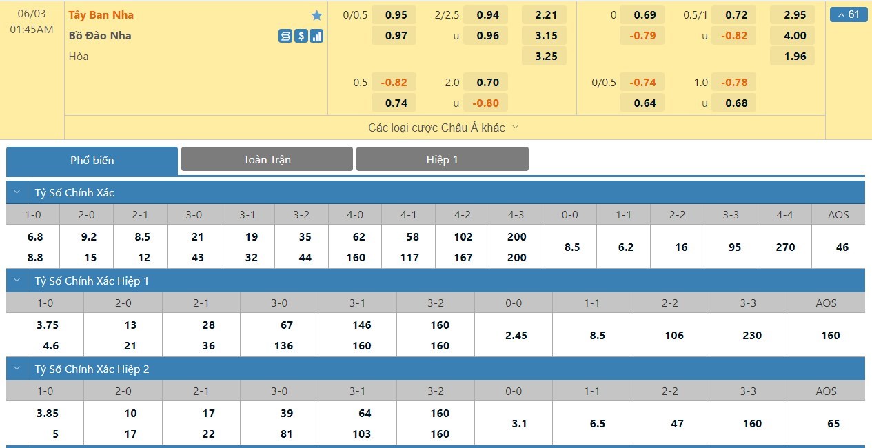 Đây thực sự là một trận cầu cân tài cân sức và khó lòng đoán định kết quả chính xác. Khả năng đôi bên chia điểm ở trận tới càng trở nên rõ ràng hơn khi chúng ta nhìn vào thành tích đối đầu của 2 đội những năm gần đây. Theo như kết quả thống kê thì Tây Ban Nha và Bồ Đào Nha đã bất phân thắng bại ở cả 4 cuộc đụng độ gần nhất. Vì vậy ở kèo châu Âu thì ô cược hòa vẫn sẽ là lựa chọn mang tới sự yên tâm cho người chơi.