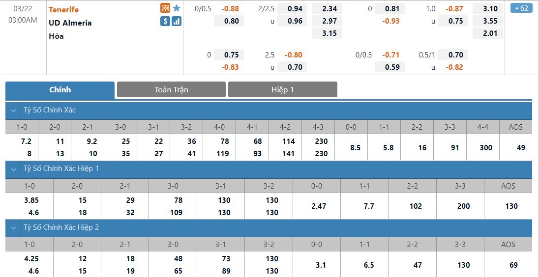 Tỷ lệ cược của Tenerife và Almeria ở kèo đấu này rất cân bằng. Tenerife có tỷ lệ là 1 ăn 2.34 trong khi đó Almeria có tỷ lệ cược là 1 ăn 2.97. Tỷ số hòa có tỷ lệ cược là 1 ăn 3.15. Phong độ của Almeria đang có phần ấn tượng hơn so với Tenerife. Ở kèo đấu này, có thể mạo hiểm với cửa dưới Almeria.