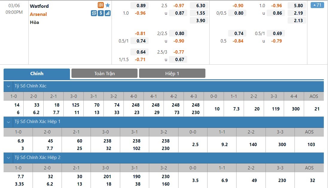 Watford lúc này đang phòng ngự không hề ấn tượng. Trong khi đó hàng công của Arsenal đang thi đấu khá ổn. Trước một đối thủ dễ chịu, Arsenal sẽ có không ít cơ hội và với việc những tiền đạo của mình đang tỏ ra sắc bén, Arsenal được dự đoán sẽ có không ít bàn thắng ở trận này. Với tỷ lệ tài xỉu ở mức 2 1/2 trái, ô cược tài sẽ là lựa chọn được đánh giá cao hơn.