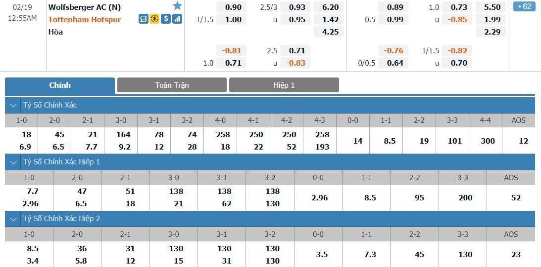 Tỷ lệ cược của 2 đội bóng ở kèo đấu này có sự chênh lệch lớn. Wolfsberger có tỷ lệ cược lên tới 1 ăn 6.20 trong khi đó Tottenham có tỷ lệ cược là 1 ăn 1.42. Tỷ số hòa có tỷ lệ cược là 1 ăn 4.25. Trình độ 2 đội vẫn đang có sự chênh lệch quá lớn và sẽ khó để Wolfsberger có thể tạo ra được bất ngờ ở trận này. Đây là trận đấu mà người chơi không nên mạo hiểm.