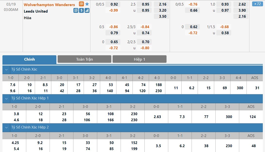 Wolverhampton chỉ được đánh giá cao hơn Leeds đôi chút ở trận này. Kết quả Wolverhampton thắng có tỷ lệ cược là 1 ăn 2.20. Kết quả Leeds thắng cũng chỉ có tỷ lệ nhỉnh hơn đôi chút với 1 ăn 3.20 trong khi đó tỷ số hòa có tỷ lệ cược cao nhất với 1 ăn 3.50. Hai đội của kèo này có thể thấy có trình độ không quá chênh lệch và ô cược hòa với một tỷ lệ cược hấp dẫn sẽ là lựa chọn ổn.