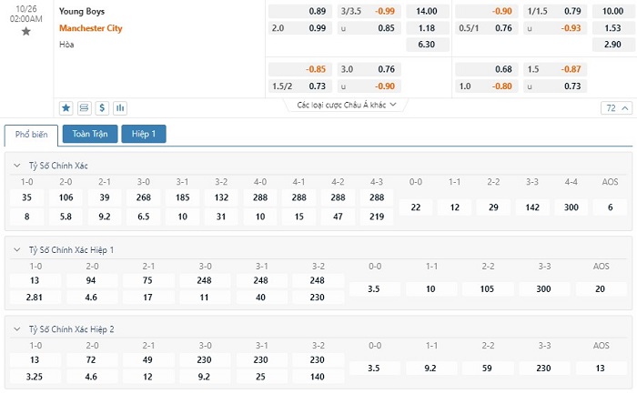 Dự đoán kèo tỷ số hiệp 1: Young Boys 0-2 Manchester City