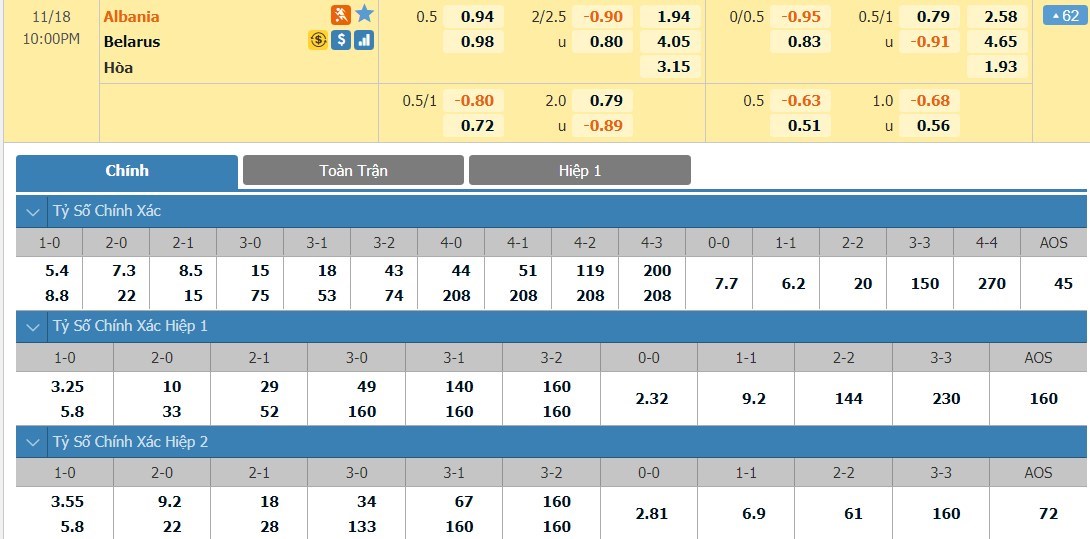 Xét trên khía cạnh thành tích đối đầu, Albania là đội nắm ưu thế khi họ bất bại trong 3 lần gần nhất chạm trán Belarus. Ở cuộc đọ sức giữa hai đội tại giai đoạn lượt đi, Albania đã giành chiến thắng 2-0 trên sân của Belarus. Vì vậy mà đây là cơ sở củng cố thêm niềm tin cho những ai muốn lựa chọn ô cược Albania trong kèo đấu này. Cả 4 màn đối đầu gần nhất giữa Albania và Belarus đều khép lại mà không vượt quá mốc 2 bàn thắng. Albania đã tịt ngòi 3 và giữ sạch lưới 2 lần trong 4 cuộc chạm trán gần nhất của mình. 90 phút tới dự kiến sẽ khó có nhiều bàn thắng do sự quan trọng của nó.