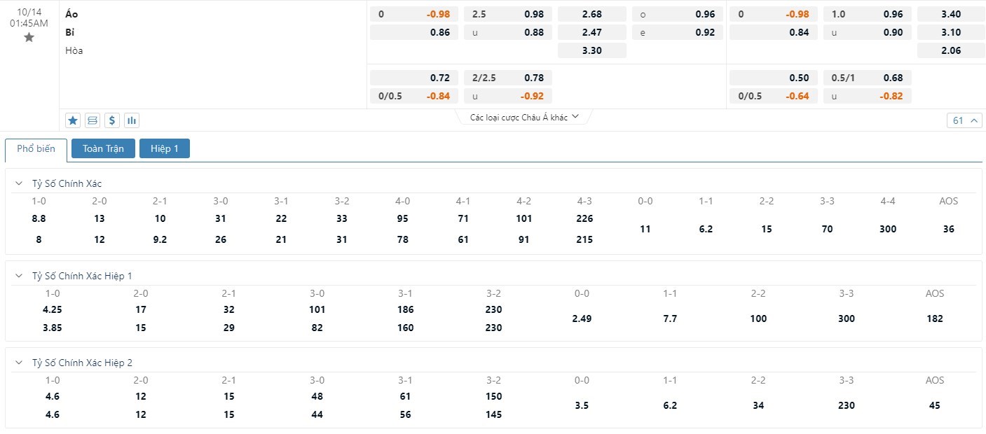 Tip kèo tỷ số hiệp 1: Áo 0-1 Bỉ