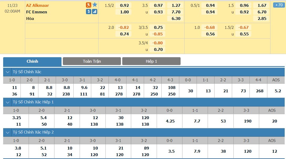 Tip kèo tỷ số hiệp 1: AZ Alkmaar 2-0 FC Emmen