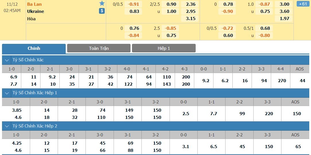 Tip kèo tỷ số hiệp 1: Ba Lan 0-0 Ukraine