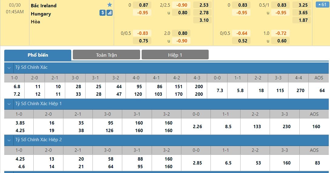 Tip kèo tỷ số hiệp 1: Bắc Ireland 0-0 Hungary