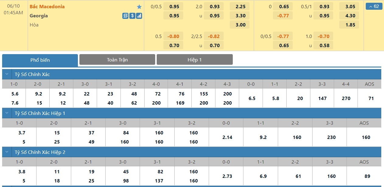 Tip kèo tỷ số hiệp 1: Bắc Macedonia 0-0 Georgia