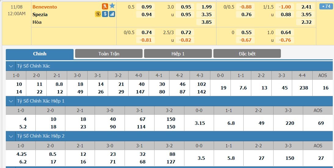 Tip kèo tỷ số hiệp 1: Benevento 1-0 Spezia
